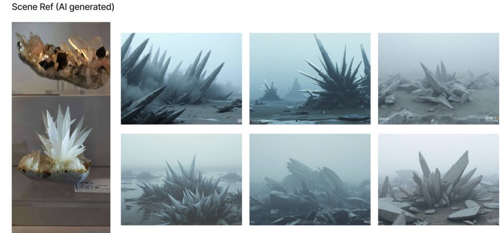 After discussing the idea with our teammates, we decided to create the final video using conceptual symbolism. This engages audiences more with visual storytelling and raises awareness more effectively. Following team feedback, we shifted towards a more symbolic style. My teammate generated AI references for atmospheric stones, which helped redefine the mood. After discussing it with him, I agreed with the atmosphere he wanted. I remodelled the seashore in Blender, created conceptual crystal stones with Geometry Nodes, and added debris, including fish fossils sourced from online references.