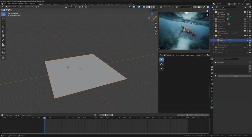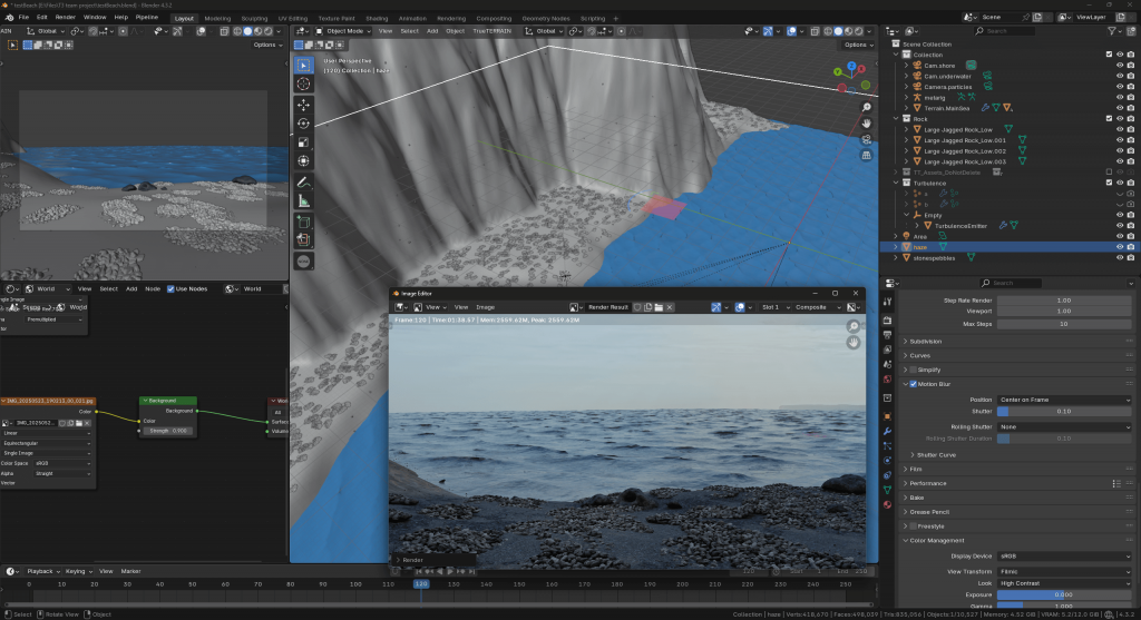Technically, I explored several ocean-simulation methods, from Blender’s default tools to Flip Fluids and True Terrain. While Unreal Engine might have offered a more efficient workflow, I supported the group’s decision to remain within Blender and Houdini, prioritising team cohesion. The True Terrain plugin ultimately proved effective in maintaining both efficiency and realism.