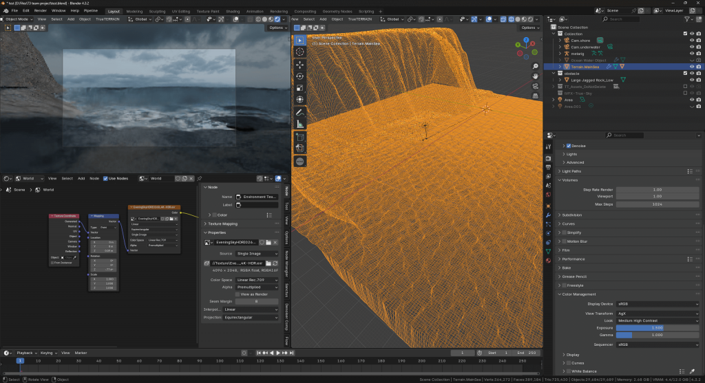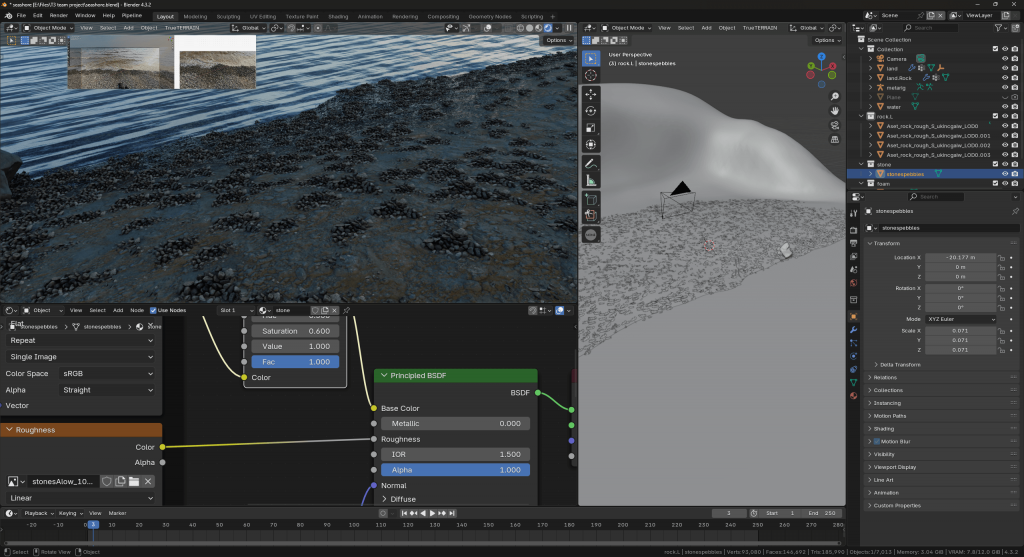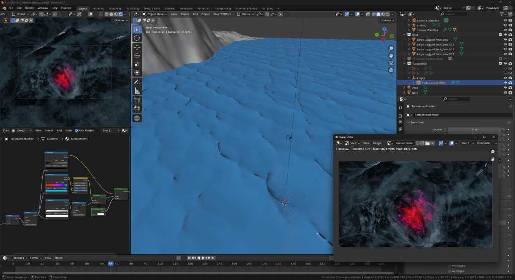 Flip Fluids plugin: only produces good results with long-time simulations and requires large disk storage, which is not suitable for the Blender creation process, especially for our project. Flip Fluid is much more efficient and realistic in Unreal, thanks to the powerful rendering system of the Unreal Engine. However, as my teammates are unwilling to use Unreal, I had to find a solution within Blender. Then I found True Terrain, which is a better solution that combines fast generation and realistic results, whether in the creation or rendering stage.