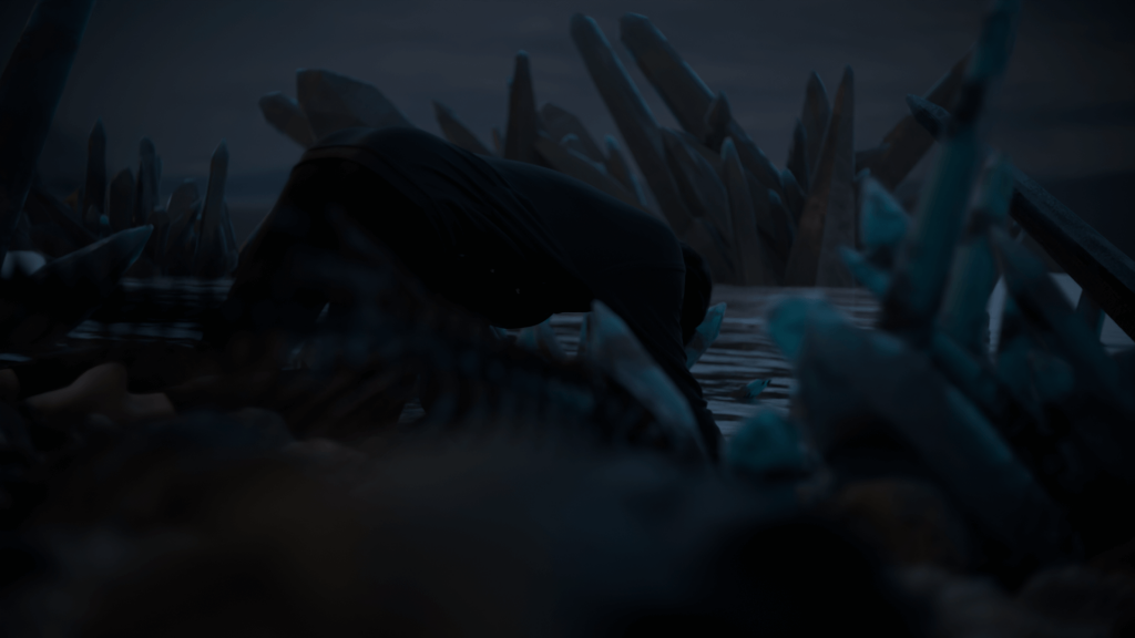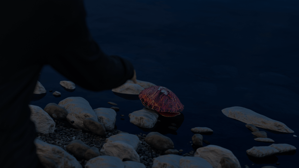 The protagonist gazes out to sea while a baby turtle slowly crawls along the beach. Waves crash against the shore. Gradually, areas of the ocean begin to turn red, and the tide creeps towards the turtle. The protagonist crouches down and reaches out, triggering a series of flashbacks showing pollution and a world devastated by environmental collapse. When the scene returns, the tide has receded, leaving behind only the turtle’s shell. Debris begins to appear on the shore.