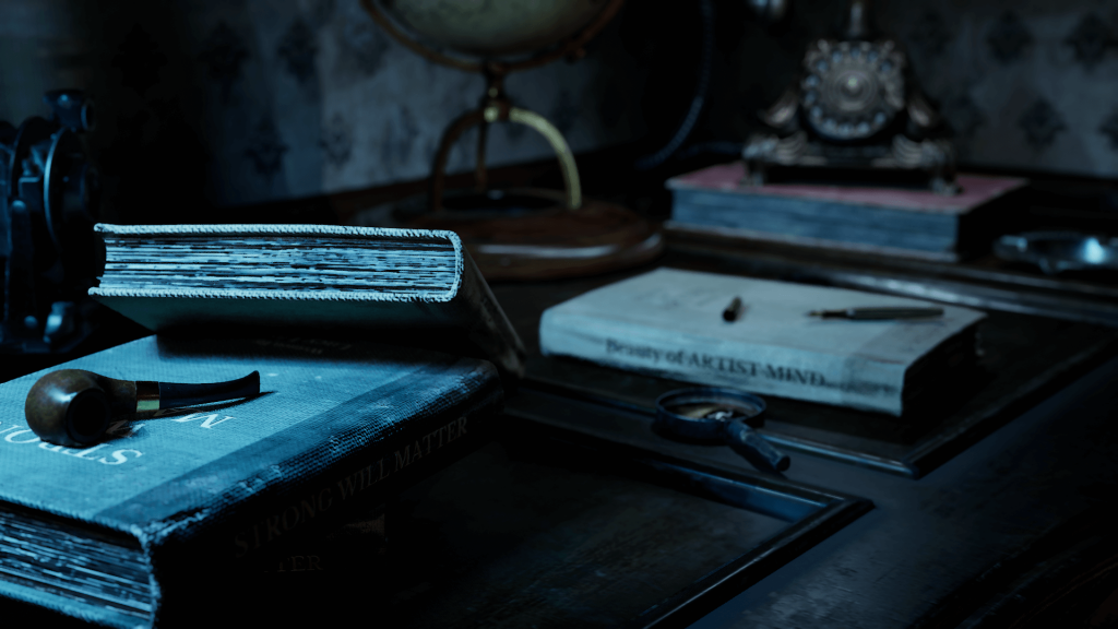 Added blue lights to emphasise the mystery, like mystery & detective games. Aimed at getting the audience to follow the focus of the light and the path to open the light behind it, open the books and turn the globe.