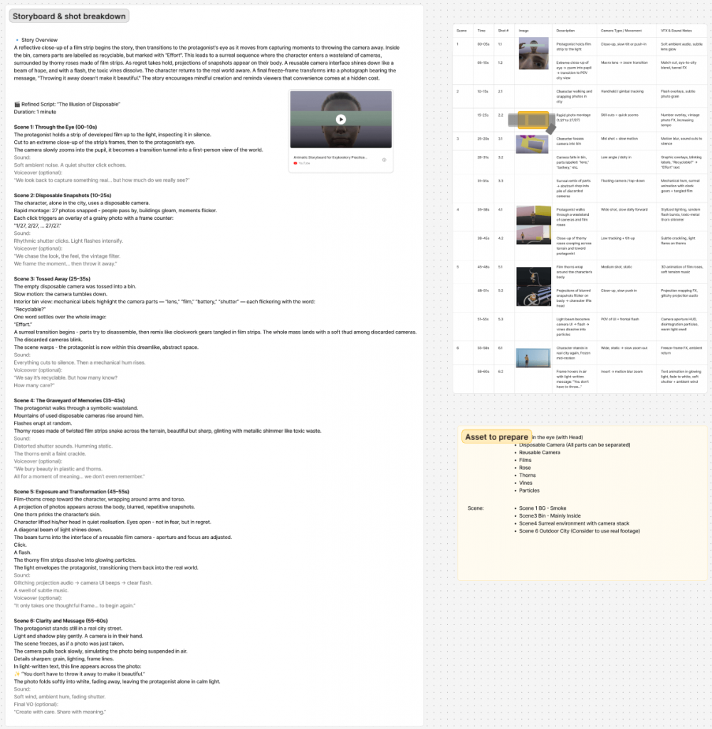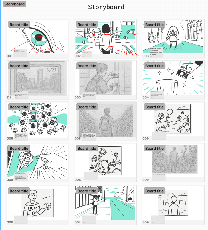 I began with sketches, moodboards and animatics, refining several versions of the narrative. An asset list was created, covering both filming footage (camera props, real locations) and CG assets (camera models, textures, and particle simulations).