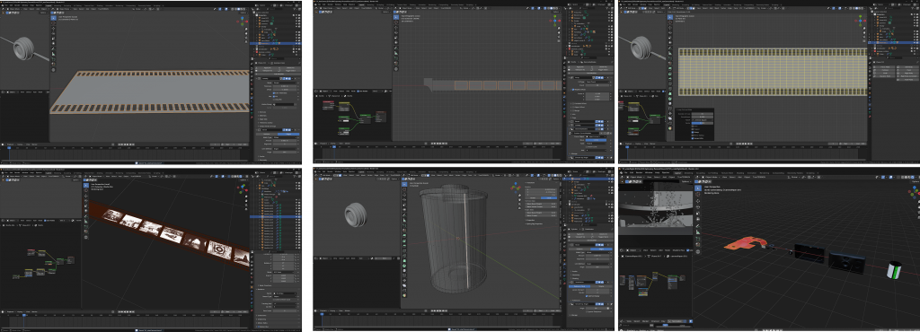 • Virtual underground: animated strips, digital platforms, floating camera debris, and particle systems integrated into a digital reconstruction.