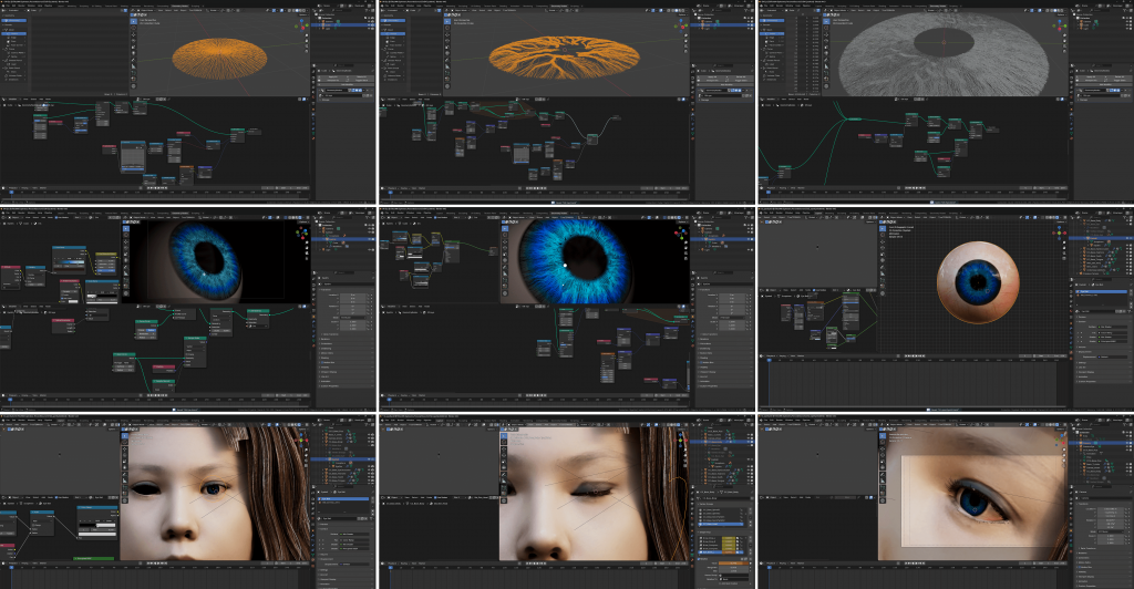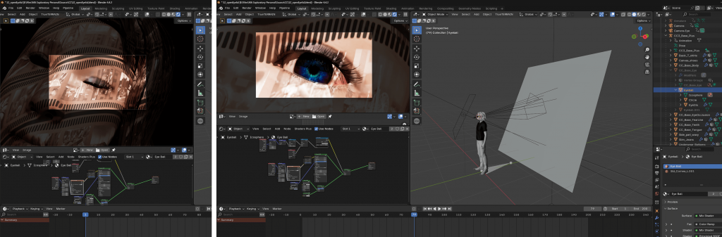 • Eye close-up: a custom iris and pupil created in Blender with Geometry Nodes, replacing the original model for more dynamic animation.
