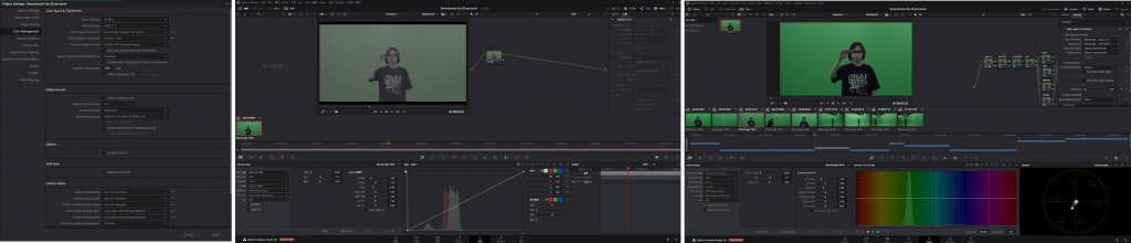 I used a Blackmagic camera, which I rented from the Kit Room at LCC, to film the green screen footage. The footage of the real city was filmed with the DJI Pocket 3. These two settings require colour consideration when performing different format and colour transformations. Braw files offer a lot of freedom to manipulate colour, but the real colour needs to be recovered first. The D-log M setting on the DJI Pocket 3 differs from standard D-log and requires a superior colour transformation method to combine different formats and colour spaces within a single project. Therefore, ACES was the best solution for this project.