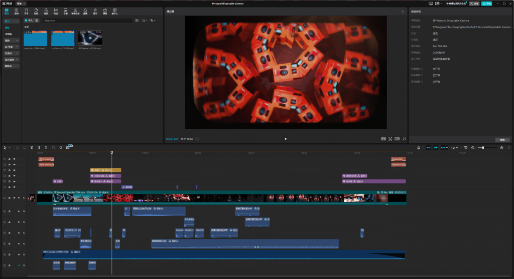 - Environment: five scenes were designed - lens opening, ripple with camera and film strips, kaleidoscopic camera drop, virtual underground, and close-up eyes sequence.